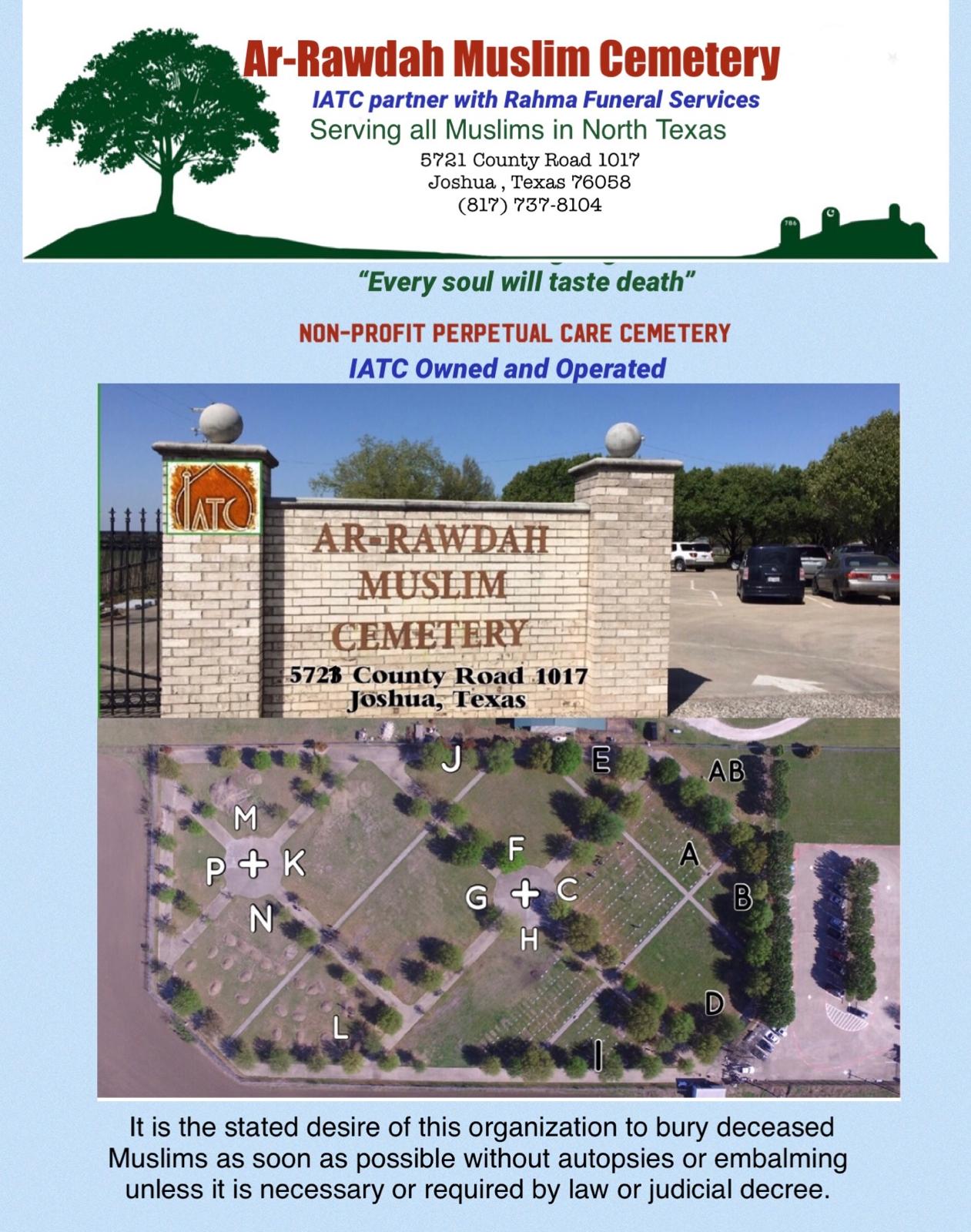 The Funeral home that Islamic Association works with is RAHMA FUNERAL HOME. It is approved/licensed by the State of Texas and has been operated by a licensed Funeral Director since August 11, 2004.